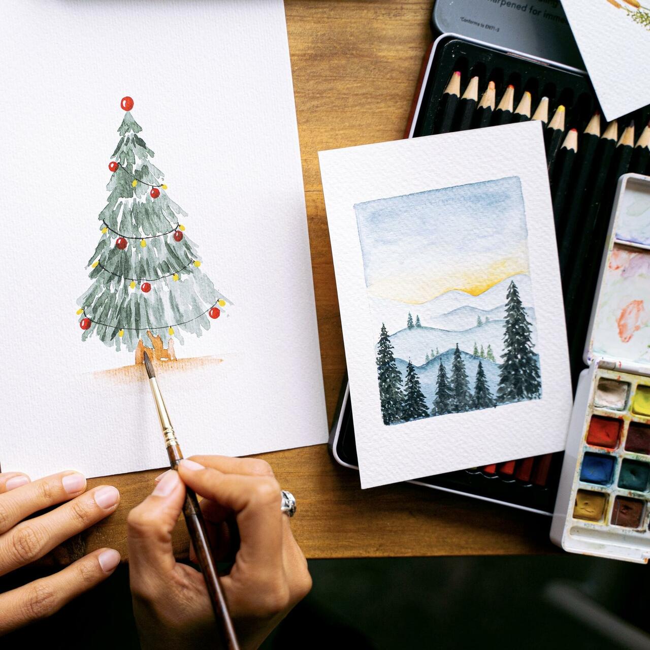 Jõulukaartide töötoas oleme eelnevalt kaardid valmis lõiganud. Tutvustame akvarellväridega maalimist ning katsetame töötoa jooksul erinevaid tehnikaid. Kaartide tegemisel kasutame akvarellvärve, dušši, markereid, vildikaid ja värvipliiatseid. Paari tunni jooksul saab kaunistada 3-6 kaardikest.